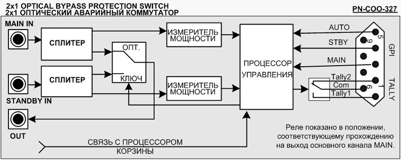 Оптический аварийный коммутатор 2х1 PN-COO-327 модульной системы “PROFNEXT” предназначен для автоматического перехода на резервную волоконно-оптическую линию связи (ВОЛС) при обнаружении уменьшения или пропадания входной оптической мощности на основной оптической линии. Блоки идеально подходят для резервирования особо важных сигнальных путей. Переключение происходит благодаря оптическому реле с “защелкой”, что обеспечивает прохождение последней выбранной оптической линии даже при выключенном блоке питания либо при извлеченной фронтальной плате. В блоке PN-COO-327 непрерывно измеряется входная оптическая мощность как в основном, так и в резервном каналах, и при уменьшении входной мощности в основном канале ниже установленного пользователем значения уровня, происходит переход на резерв. Возвращение возможно как в автоматическом, так и в ручном режимах. Задержка переключения на резервный канал и время возврата программируются пользователем. Оптический аварийный коммутатор 2х1 PN-COO-327GPI не имеет автоматического режима работы и может переходить на резерв только по командам GPI или от управления с компьютера. Модули серии PN-COO-327, PN-COO-327GPI предназначены для работы в базовой конструкции модульной системы "PROFNEXT". Размещаются в корпусах 1U или 3U системы "PROFNEXT" и занимают один слот в корпусе. В корпусах 1U блоки размещаются горизонтально, в корпусах 3U – вертикально. Модули серии PN-COO-327, PN-COO-327GPI предназначены для круглосуточной работы в стационарном помещении с температурой окружающего воздуха от +5 до +45оС, относительной влажности не более 80% при температуре 25оС, атмосферном давлении 750±30 мм рт. ст.