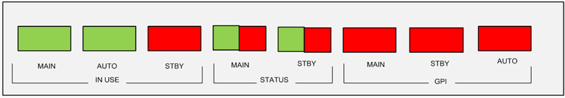 Секция IN USE MAIN….. горит зеленым, если на выход коммутатора проходит сигнал со входа MAIN. AUTO…. горит зеленым в режиме AUTO. STBY…. горит красным, если на выход коммутатора проходит сигнал со входа STBY.