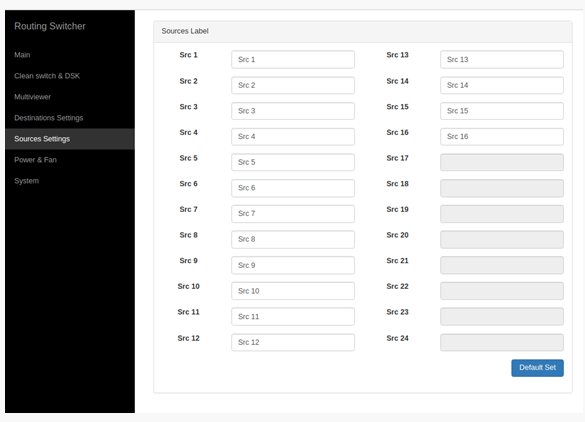Sources Settings – вкладка для определения пользователем названий входов коммутатора (латинские буквы, цифры и спецсимволы, не более 16 символов) для UMD (подмониторного дисплея) мультиэкрана и отображения на пультах управления, имеющих LCD экран. Default Set – кнопка для установки имен входов по умолчанию (Src 1…Src 24). Вкладка Power & FanВкладка для контроля состояния блоков питания коммутатора.