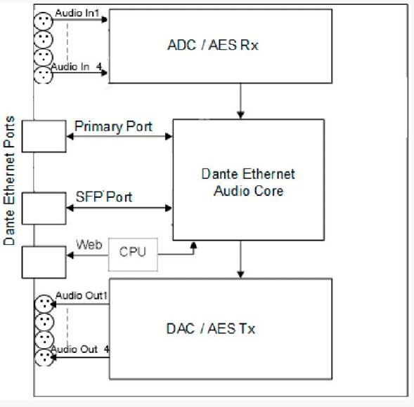 Аудиоинтерфейс обеспечивает передачу/прием по сети Dante до 4 входных и 4 выходных аудиосигналов. Количество аудиосигналов в зависимости от их типа (возможны различные комбинации входов и выходов):
