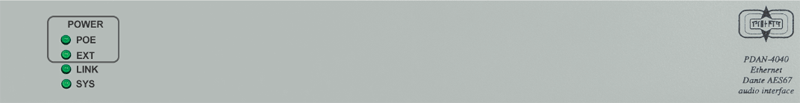 Цифровые субмодули сигналов AES3 поддерживают режим передачи User Bits и Channel Status Bits (устройство совместимо с оборудованием служебной связи Riedel). Устройство имеет электрическиий порт Ethernet (Dante P3) и один оптический порт (Dante P0). Наличие оптической линии передачи через отдельный SFP модуль позволяет распространять сеть Dante по оптическим линиям связи на большие расстояния. SFP модуль Ethernet в состав устройства не входит и заказывается отдельно. Дополнительный электрический порт Ethernet используется для подключения к собственному web-интерфейсу устройства и протоколу Ember+, с помощью которых можно осуществлять мониторинг и настройку внешних аудиоинтерфейсов (доступно в будущих версиях). Питание PDAN-4040 осуществляется по технологии РсЕ или от внешнего источника +12В. На лицевой панели находятся светодиоды, показывающие состояние устройства. На задней панели установлены разъемы XLR для подключения к устройству внешних аудиосигналов, сетевые интерфейсы и разъем питания. Устройство предназначено для круглосуточной работы в стационарном помещении с температурой окружающего воздуха от +5°C до +40°С и относительной влажности воздуха до 80%.