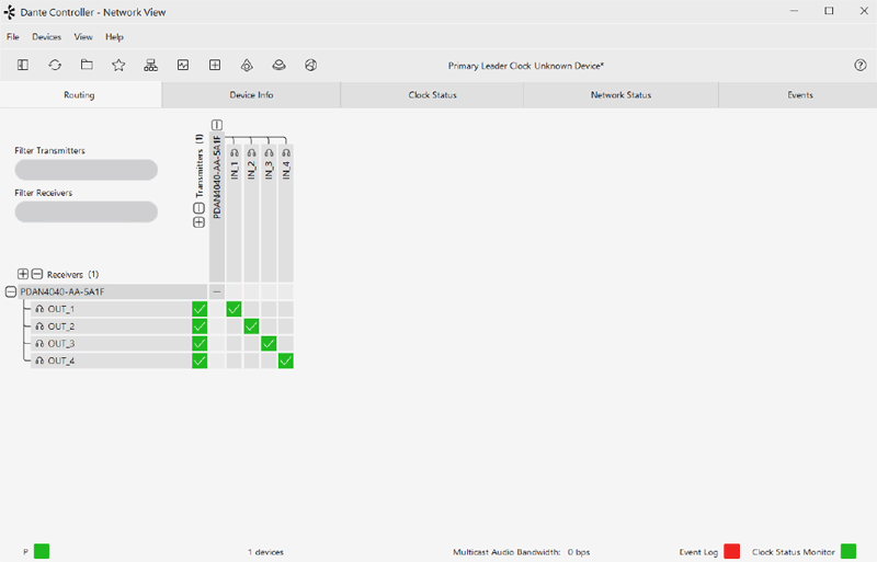 Аудиоинтерфейс PDAN-4040 видится в Dante Controller, как матрица 4х4. На рисунке приведен пример отображения устройства PDAN-4040-AA. В данной модификации доступны 4 линейных аудиовхода и 4 линейных аудиовыхода. Для удобства проверки и настройки устройства в данном примере все входы и выходы скоммутированы между собой.