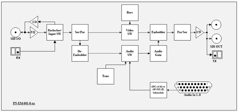 Блок ввода 8-и каналов звука в 12G/6G/3G/HD/SD SDI серии PN-EM-601-8-x (далее по тексту “эмбеддер”) предназначен для: