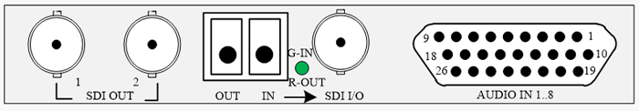 В шифре блоков индекс “X” означает тип установленного звукового субмодуля: “А” – субмодуль аналоговый входной, “М” – субмодуль микрофонный, “Е” – субмодуль цифровой входной. Входы аудио сигналов балансные. Количество поддерживаемых входных аудио каналов, а также их формат, зависит от установленных в блок звуковых субмодулей. В модели с индексом «8» можно установить один субмодуль. Аналоговые субмодули имеют 8 входов, цифровые субмодули имеют 4 входа AES. Субмодули входные микрофонные кроме поддержки сигналов от микрофонов обеспечивают подачу напряжения «+48В» на микрофоны.