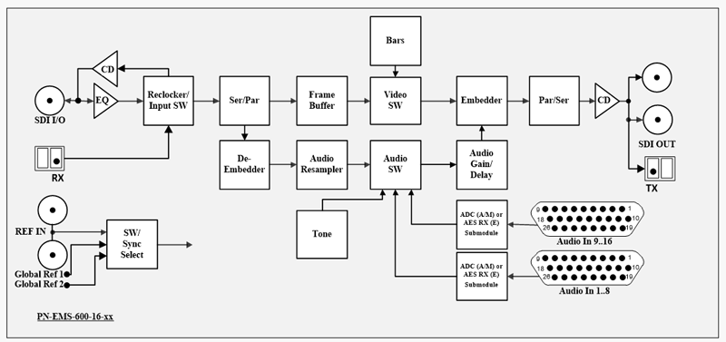 Сигнал с входа SDI IN поступает на кабельный корректор (EQ) и далее на входной коммутатор Input SW. На второй вход коммутатора приходит сигнал с оптического входа IN(RX). Сигнал с выбранного входа проходит через блок восстановления тактовой частоты (Reclocker) и поступает на SDI декодер (Ser/Par), где преобразуется в 20-разрядный поток 4:2:2. С выхода декодера сигнал поступает на De-Embeder, где извлекаются звуковые аудио каналы. Если выбран оптический вход, то разъем SDI I/O становится проходным электрическим выходом оптического сигнала IN(RX). Затем видео данные записывается в память (Frame Buffer), после чего считывается на частоте опорного сигнала. При наличии опорного сигнала на входе блока (вход устанавливается пользователем - локальный вход REF IN или один из глобальных входов Global Ref1/2 (SW/Sync Select)), привязка осуществляется к данному сигналу, при отсутствии – либо от внутреннего генератора, либо от входного сигнала. Извлеченные из входного сигнала SDI аудио данные пере тактируются к тактовой частоте, привязанной к опорному сигналу (Audio Resampler). Далее они поступают на звуковой коммутатор (Audio SW). Внешние звуковые сигналы после преобразования в АЦП или декодерах AES (ADC (А/M) or AES RX (E) Submodule), так же поступают на звуковой коммутатор, где происходит выбор звуковых каналов для замешивания в выходной сигнал SDI. Перед замешиванием звуковых данных в выходной сигнал (Embedder), можно задать усиление для каждой канальной пары в пределах ±6дБ (Audio Gain/Delay) и задержку до 50 кадров. После SDI кодера (Par/Ser) сигнал через кабельный драйвер поступает на выходы SDI OUT и оптический выход OUT (TX). Формат выходного видеосигнала определяется входным и определяется автоматически. При отсутствии сигнала на входе, можно выбрать необходимый формат и вид тестового сигнала. Формат опорного сигнала REF IN может не совпадать с форматом входного сигнала, но должен иметь кратную кадровую частоту. В этом случаи привязка выходного сигнала будет только по кадру.