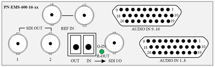 В шифре блоков индекс “X” означает тип установленного звукового субмодуля: “А” – субмодуль аналоговый входной, “М” – субмодуль микрофонный, “Е” – субмодуль цифровой входной. Входы аудио сигналов балансные. Количество поддерживаемых входных аудио каналов, а также их формат, зависит от установленных в блок звуковых субмодулей. В модели с индексом «16» можно установить два субмодуля. Аналоговые субмодули имеют 8 входов, цифровые субмодули имеют 4 входа AES. Субмодули входные микрофонные кроме поддержки сигналов от микрофонов обеспечивают подачу напряжения «+48В» на микрофоны.