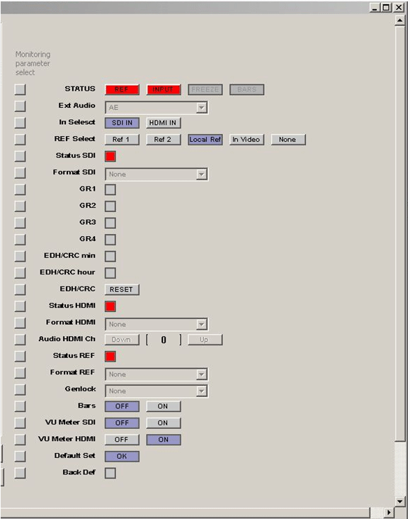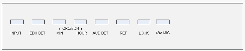 Ext Audio – индикация установленных звуковых модулей (A – аналоговый, M – аналоговый микрофонный, E – цифровой, X – отсутствие модуля) In Select – выбор входа модуля; Ref Select – выбор источника синхронизации блока; Status SDI – индикатор состояния входа SDI IN, горит красным при появлении одного из установленных событий меню Alarm для входного сигнала; Format SDI – информация о формате входного сигнала SDI; GR1 ... 4 – наличие звуковых групп во входном сигнале SDI; EDH/CRC – информация о наличии ошибок EDH/CRC за минуту и час во входном сигнале SDI, горят красным, если произошла ошибка; Reset – сброс ошибок EDH/CRC; Bars – вкл./выкл. тестового сигнала Bars; Default Set – сброс настроек модуля к значениям по умолчанию.