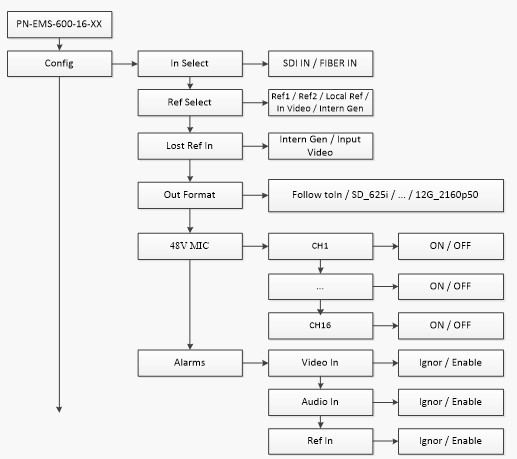 <Config> <Ref Select > - Выбор источника синхронизации модуля. <Config> <Lost Ref In> - Выбор источника синхронизации при пропадании сигнала на входе Ref In. <Config> <Out Format> - Выбор выходного формата на выходе блока: <Follow to In> - определяется последним допустимым входным сигналом; <SD_625I, … , 12G_2160p50 > - устанавливается заданный формат. <Config> <48V MIC> - Включение фантомного питания +48 V на микрофонных входах CH1-CH16 (если установлен микрофонный субмодуль).