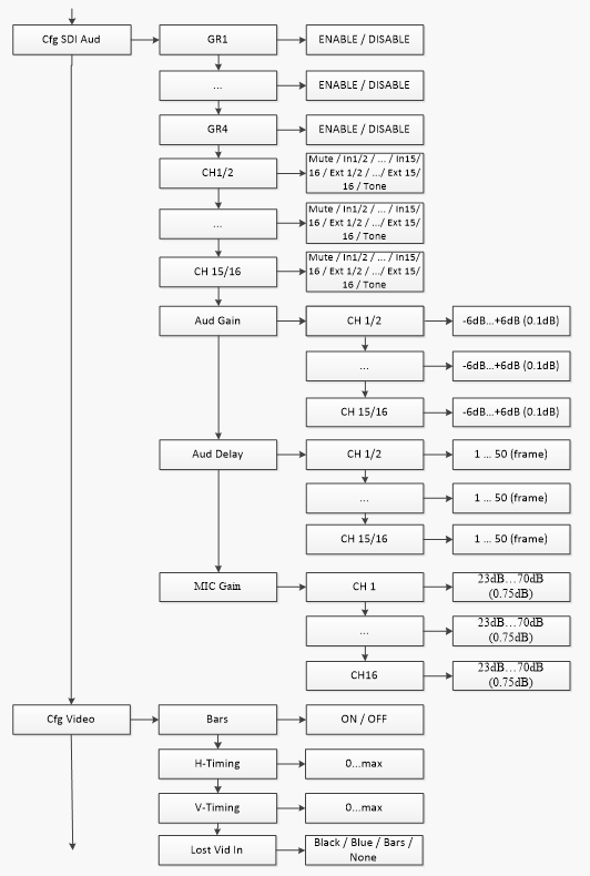 <Cfg SDI Aud > <SDI CH 1/2> - Назначение входных аудио сигналов на 1/2 каналы первой выходной аудио группы. … <Cfg SDI Aud > <SDI CH 15/16> - Назначение входных аудио сигналов на 15/6 каналы четвертой выходной аудио группы.
