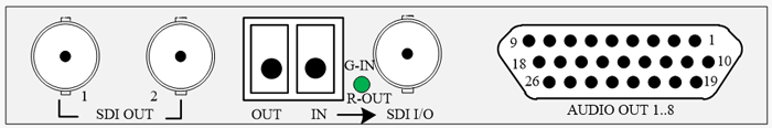 Имеется слот для установки оптического SFP видео. Оптический SFP модуль может быть одноканальным (на вход или выход) или двухканальным (на вход и выход) и позволяет производить замену модуля, не выключая устройство. Кроме того, он позволяет получить информацию о мощности излучения на входе приемника, выходе передатчика и длине волны на выходе передатчика. Если выбран оптический вход, то разъем SDI I/O становится проходным электрическим выходом оптического сигнала IN. Оптический SFP модуль в состав не входит. Тип модуля SFP заказывается отдельно.