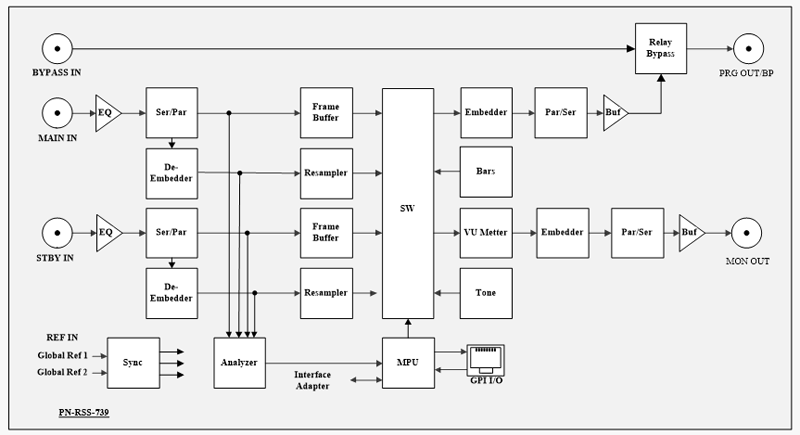 Входной сигнал SDI MAIN IN / STBY IN поступает на кабельный корректор (EQ), затем на SDI декодер (Ser/Par), где преобразуется в 20-разрядный поток 4:2:2. С выхода декодера сигнал поступает на De-Embeder, где извлекаются четыре звуковые аудио группы. Видео данные записывается в память (Frame Buffer), после чего считывается на частоте опорного сигнала. В качестве опорного сигнала блока может быть один из глобальных входов корзины Global Ref 1/2 (REF IN), либо внутренний генератор. Аудио данные пере тактируются к тактовой частоте, привязанной к опорному сигналу (Resampler). Так же входные данные подаются на блок анализа входных сигналов Analyzer. Микроконтроллер управляет коммутатором SW, в зависимости от установленного режима работы блока и данных с выхода блока Analyzer. На выходе звуковые данные эмбедируются в выходной видеосигнал (Embedder) и формируется сигнал SDI (Par/Ser), который после кабельного драйвера поступает на выход платы SDI PRG OUT/BP / SDI MON OUT. На мониторном выходе можно включить наложение индикатора уровня звука входного сигнала, который подается на этот выход. Мониторный выход можно использовать как второй программный выход установив соответствующий режим (PGM).