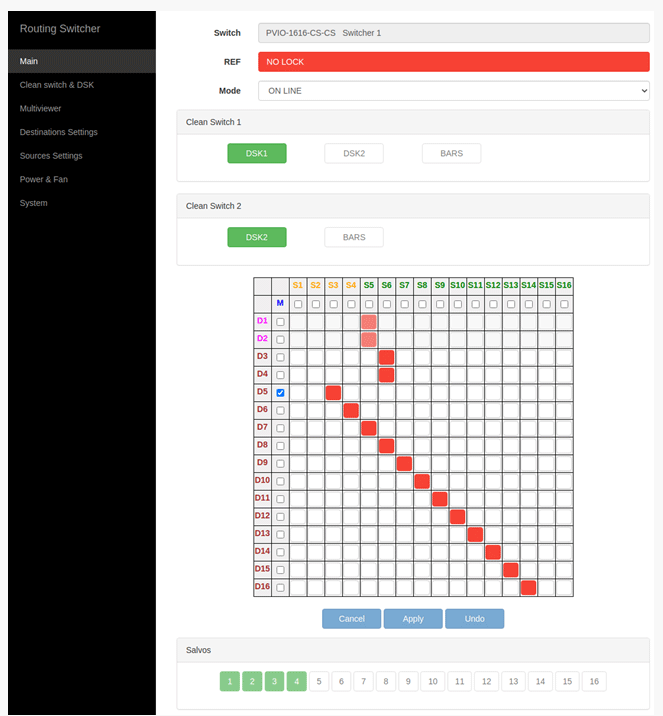 Switch – тип коммутатора и его имя, определенное пользователем на вкладке System. Mode – режим коммутатора при управлении от WEB-интерфейса PRESET – коммутация всех выходов c предварительной подготовкой; ON LINE – мгновенная коммутации одного выхода; SAVE MEMORY – режим создания и сохранения вариантов соединения всех выходов коммутатора (Salvos 1…16); CLEAR MEMORY – режим удаления сохраненных ранее и привязанных к кнопкам Salvos 1…16 вариантов соединения. Для удаления сохраненного варианта кликните левой клавишей мыши на соответствующую кнопку в секции Salvos. В появившемся диалоговом окне подтвердите свой выбор (вариант будет удален, кнопка освобождена) или откажитесь от удаления. Clean Switch 1(2) – секции управления каналами DSK на соответствующем “чистом” выходе. Активны, если коммутатор имеет соответствующие опции и использование канала DSK разрешено пользователем (вкладка Clean switch & DSK). DSK 1 – включение и выключение DSK1; DSK 2 – включение и выключение DSK2; BARS – включение и выключение тестового сигнала; Salvos – секция выбора варианта соединения всех выходов коммутатора в режиме PRESET.