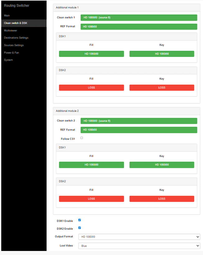 Additional module 1 и 2 – секции для отображения информации о состоянии дополнительных модулей. Если модуль не установлен, то соответствующая секция не активна. Clean switch 1(2) (outputs 1(3) и 2(4)) – номер входа и стандарт сигнала, поданного на соответствующий “чистый” выход. Красный цвет свидетельствует об отсутствии сигнала, зеленый – сигнал в норме. REF Format – информация о формате опорного сигнала REF и статусе захвата ФАПЧ на модуле “чистого” выхода от источника синхронизации блока. Красный цвет свидетельствует об отсутствии сигнала на входе REF, желтый – сигнал есть, но нет захвата, а зелёный – сигнал захвачен. DSK 1(2) – информация о состоянии сигналов DSK Fill – наличие и формат сигнала на входе Fill. Красный цвет свидетельствует об отсутствии сигнала, зелёный – сигнал в норме. Key – наличие и формат сигнала на входе Key. Красный цвет свидетельствует об отсутствии сигнала, зелёный – сигнал в норме. Follow CS1 – включение и выключения режима одновременного переключения сигналов на выходах CS1 и CS2.