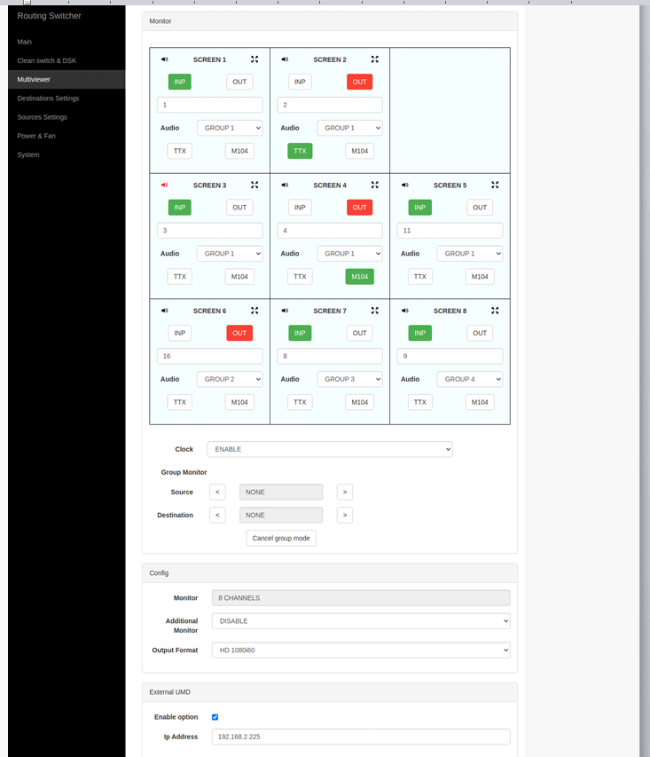 В секции Monitor в схематичном виде представлено расположение окон мультиэкрана на мониторном выходе коммутатора. Внутри каждого окна находятся индивидуальные органы настройки: Кнопки INP, OUT и строка с номером позволяют выбрать вход или выход коммутатора, отображаемый в данном окне мультиэкрана. Если в окне отображается вход, то на мониторе в нижней части окна выводится поле с номером и названием выбранного источника. Если в окне отображается выход, то на мониторе в верхней части окна выводится поле с номером и названием выбранного выхода, а в нижней части окна выводится поле с номером и названием источника, поданного в данный момент на выбранный выход; Audio – выбор звуковой группы, отображаемой на звуковых индикаторах в данном окне мультиэкрана; TTX – кнопка включения индикатора наличия телетекста в сигнале, отображаемом в данном окне мультиэкрана; М104 – кнопка включения индикатора наличия метки SCTE-104 в сигнале, отображаемом в данном окне мультиэкрана. На индикаторе отображается время прихода последней метки;