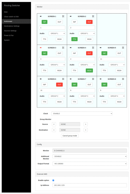 Config – секция для конфигурирования основного и дополнительного выходов мультиэкрана: Monitor – поле отображения количества каналов мультиэкрана (4 или 8) на основном мониторном выходе коммутатора; Additional Monitor – поле включения дополнительного выхода мультиэкрана (доступно только в случае установки в коммутатор восьмиканального мультиэкрана). При этом происходит переконфигурирование коммутатора таким образом, что первые четыре окна мультиэкрана остаются на основном мониторном выходе коммутатора, а вторые четыре окна (с 5 по 8) переключаются на последний выход коммутатора, который становится недоступен для обычной коммутации. Таким образом у коммутатора получается два независимых четырехканальных выхода мультиэкрна (рис. 3). Внешний вид вкладки Multiviewer также измениться в соответствии с количеством мониторных выходов. Output Format – выбор стандарта сигнала на основном и дополнительном мониторных выходах мультиэкрана. External UMD – секция настройки работы с внешним UMD (подмониторным дисплеем). Enable option – разрешение работы с внешним UMD; Ip Address – ip-адрес внешнего UMD для передачи ему информации в соответствии с протоколом TSL UMD (v.3.1, v4.0). Внешнему UMD передаются названия сигналов поданных на выходы коммутатора.