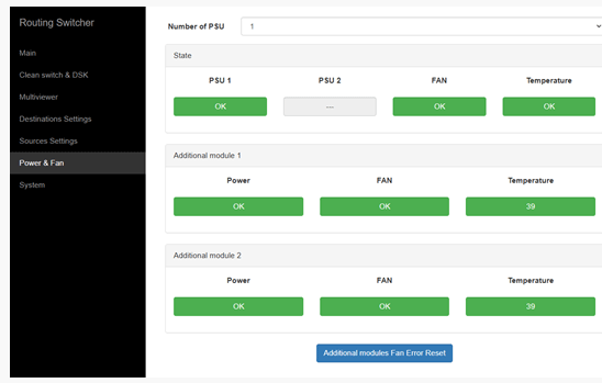 Sources Settings – вкладка для определения пользователем названий входов коммутатора (латинские буквы, цифры и спецсимволы, не более 16 символов) для UMD (подмониторного дисплея) мультиэкрана и отображения на пультах управления, имеющих LCD экран. Default Set – кнопка для установки имен входов по умолчанию (Src 1…Src 24). Вкладка Power & FanВкладка для контроля состояния блоков питания коммутатора.