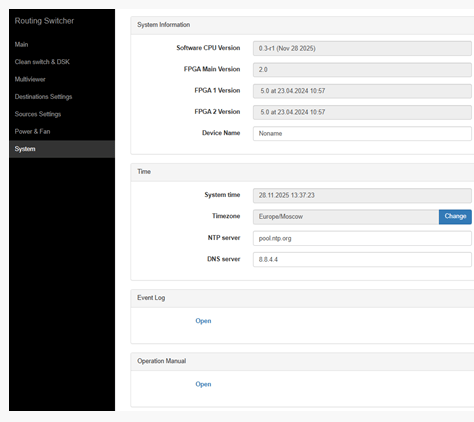 System Information – секция отображение текущих версий программного обеспечения и имени коммутатора. Software CPU Version – версия программного обеспечения центрального процессора коммутатора. FPGA Main Version – версия программного обеспечения программируемой логики, расположенной на основной плате комутатора. FPGA 1 Version – версия программного обеспечения программируемой логики первого дополнительного модуля (“Undefined” – если модуль не установлен). FPGA 2 Version – версия программного обеспечения программируемой логики второго дополнительного модуля (“Undefined” – если модуль не установлен). Device Name – название коммутатора, которое задается пользователем и отображается на главной вкладке в стоке Switch. Time – секция временных настроек коммутатора System time – отображение даты и времени, установленных в коммутаторе. Если время не было синхронизировано по протоколу NTP, то дата и время, установленные в коммутаторе могут отличаться от истинных значений и будут отображаться на красном фоне. Для корректного отображения времени при записи в журнал событий необходимо синхронизировать его с NTP сервером. Timezone – выбор часового пояса. NTP server – выбор адреса NTP сервера для синхронизации времени и даты. DNS server – выбор адреса DNS сервера.