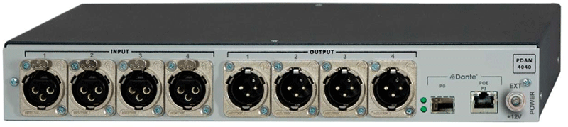 Цифровые субмодули сигналов AES3 поддерживают режим передачи User Bits и Channel Status Bits (устройство совместимо с оборудованием служебной связи Riedel). Устройство имеет электрическиий порт Ethernet (Dante P3) и один оптический порт (Dante P0). Наличие оптической линии передачи через отдельный SFP модуль позволяет распространять сеть Dante по оптическим линиям связи на большие расстояния. SFP модуль Ethernet в состав устройства не входит и заказывается отдельно. Дополнительный электрический порт Ethernet используется для подключения к собственному web-интерфейсу устройства и протоколу Ember+, с помощью которых можно осуществлять мониторинг и настройку внешних аудиоинтерфейсов (доступно в будущих версиях). Питание PDAN-4040 осуществляется по технологии РсЕ или от внешнего источника +12В. На лицевой панели находятся светодиоды, показывающие состояние устройства. На задней панели установлены разъемы XLR для подключения к устройству внешних аудиосигналов, сетевые интерфейсы и разъем питания. Устройство предназначено для круглосуточной работы в стационарном помещении с температурой окружающего воздуха от +5°C до +40°С и относительной влажности воздуха до 80%.