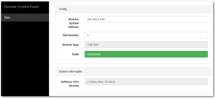 Для совместной работы ПУ с конкретным устройством, необходимо выбарть его тип и для подключения по сети Ethernet задать сетевые параметры модульной системы, в которой он установлен. Настройка этих параметров осуществляется с помощью встроенного WEB интерфейса. Для выполнения успешного подключения к web-серверу ПУ необходимо удостовериться, что персональный компьютер имеет верные настройки сети Ethernet. При этом следует проконтролировать беспрепятственное прохождение TCP/IP-пакетов от локального компьютера до ПУ через сеть. Подключитесь к встроенному web-серверу пульта управления. Для этого на компьютере в адресной строке web-браузера наберите IP-адрес ПУ. В случае успешного подключения будет выведена страница с основными параметрами устройства («Мат»). Секция «Config»: • IP-адрес модульной системы, где установлено устройство, которым должен управлять данный пульт («Modular System Address»), • номер слота модульной системы (1... 16), в котором установлено устройство («Slot Number»), • выбор типа устройства, которым должен управлять пульт («Module Type»), • отображение состояния наличия указанного устройства в выбранном слоте модульной системы с установленным IP-адресом. Если устройство обнаружено и получена его таблица состояния, то в этой строке на зеленом фоне будет выведено сообщение "Connected", в противном случае в этой строке на красном фоне будет выведено сообщение "No Connected" («State»).