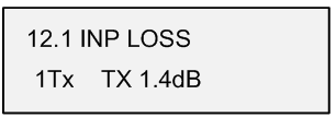 «12.1» ……… 12-ый модуль, первая страница подменю. «INP» ……… Наличие входного электрического сигнала и его скорость (LOSS, SD, HD, 3G). «1Tx» ………Функциональное назначение (одноканальный передатчик). Повторяется на всех последующих страницах подменю. «TX 1.4dB»… Выходная оптическая мощность лазера.