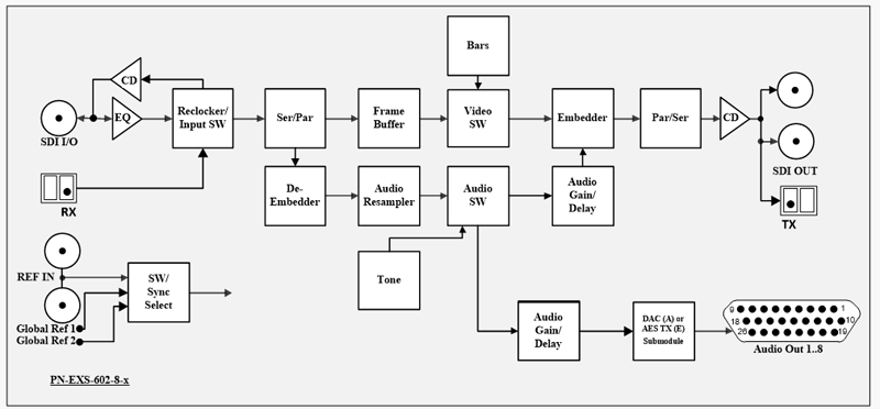 Сигнал с входа SDI IN поступает на кабельный корректор (EQ) и далее на входной коммутатор Input SW. На второй вход коммутатора приходит сигнал с оптического входа IN(RX). Сигнал с выбранного входа проходит через блок восстановления тактовой частоты (Reclocker) и поступает на SDI декодер (Ser/Par), где преобразуется в 20-разрядный поток 4:2:2. С выхода декодера сигнал поступает на De-Embeder, где извлекаются звуковые аудио каналы. Если выбран оптический вход, то разъем SDI I/O становится проходным электрическим выходом оптического сигнала IN(RX). Затем видео данные записывается в память (Frame Buffer), после чего считывается на частоте опорного сигнала. При наличии опорного сигнала на входе блока (вход устанавливается пользователем - локальный вход REF IN или один из глобальных входов Global Ref 1/2 (SW/Sync Select)), привязка осуществляется к данному сигналу, при отсутствии – либо от внутреннего генератора, либо от входного сигнала. Извлеченные из входного сигнала SDI аудио данные пере тактируются к тактовой частоте, привязанной к опорному сигналу (Audio Resampler). Далее они поступают на звуковой коммутатор (Audio SW). Перед замешиванием звуковых данных в выходной сигнал (Embedder), можно задать усиление для каждой канальной пары в пределах ±6дБ (Audio Gain/Delay) и задержку до 100 кадров. С другого выхода звукового коммутатора звуковые сигналы проходят через блок регулировки уровня ±6дБ (Audio Gain/Delay) и задержки до 100 кадров. Далее, через звуковые субмодули (DAC (А) or AES TX (E) Submodule) в аналоговом или цифровом формате, звуковые сигналы поступают на выходы (Audio Out 8..1).