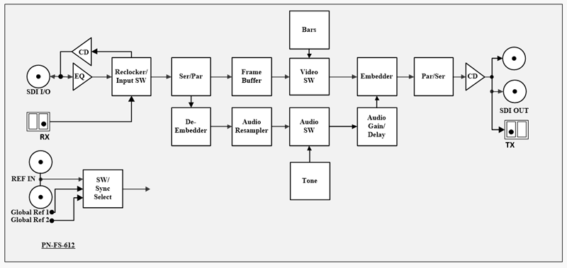 Сигнал с входа SDI IN поступает на кабельный корректор (EQ) и далее на входной коммутатор Input SW. На второй вход коммутатора приходит сигнал с оптического входа IN(RX). Сигнал с выбранного входа проходит через блок восстановления тактовой частоты (Reclocker) и поступает на SDI декодер (Ser/Par), где преобразуется в 20-разрядный поток 4:2:2. С выхода декодера сигнал поступает на De-Embeder, где извлекаются звуковые аудио каналы. Если выбран оптический вход, то разъем SDI I/O становится проходным электрическим выходом оптического сигнала IN(RX). Затем видео данные записывается в память (Frame Buffer), после чего считывается на частоте опорного сигнала. При наличии опорного сигнала на входе блока (вход устанавливается пользователем - локальный вход REF IN или один из глобальных входов Global Ref 1/2 (SW/Sync Select)), привязка осуществляется к данному сигналу, при отсутствии – либо от внутреннего генератора, либо от входного сигнала. Извлеченные из входного сигнала SDI аудио данные пере тактируются к тактовой частоте, привязанной к опорному сигналу (Audio Resampler). Далее они поступают на звуковой коммутатор (Audio SW). Перед замешиванием звуковых данных в выходной сигнал (Embedder), можно задать усиление для каждой канальной пары в пределах ±6дБ (Audio Gain/Delay) и задержку до 100 кадров.