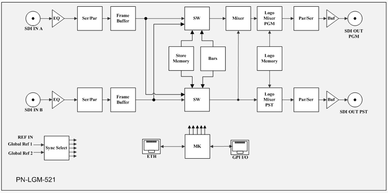Логогенератор, бесподрывный коммутатор/микшер сигналов 3G/HD/SD SDI PN-LGM-521 (далее по тексту логогенератор) предназначен для, коммутации или микширования двух сигналов 3G/HD/SD SDI с синхронизацией каждого из каналов к опорному сигналу REF, наложения логотипов на выходной сигнал. Формирование статических, динамических и текстовых логотипов и “бегущих строк” на двух графических слоях, до -3-х непересекающихся логотипов на каждом слое. Формирование заставки со звуковым сопровождением. Общее количество пикселей всех фаз логотипа не должно превышать 20 611 752 (~78MB). Поддерживаемые форматы графических логотипов: targa 32 бита с альфа-каналом. Имеется возможность загрузки звуковых данных формата WAV для вставки звука во время заставки. Местное управление по GPI. Прием информации от внешних источников метеоданных и времени от внешних NTP-серверов по сети ETHERNET. Выдача предварительно загруженных “бегущих строк” в реальном времени от ПК (RSS). Возможность привязки графических композиций ко входам. Выходы Preset (OUT PST), Program (OUT PGM). Релейный обход. WEB интерфейс для управления и загрузки графической информации. Для синхронизации блока используется один из глобальных входов синхронизации корзины.