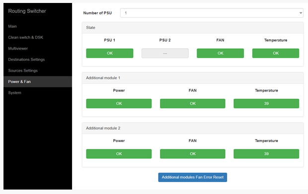 Additional module 1 и 2 – секции для отображения информации о состоянии дополнительных модулей. Если модуль не установлен, то соответствующая секция не активна. Clean switch 1(2) (outputs 1(3) и 2(4)) – номер входа и стандарт сигнала, поданного на соответствующий “чистый” выход. Красный цвет свидетельствует об отсутствии сигнала, зеленый – сигнал в норме. REF Format – информация о формате опорного сигнала REF и статусе захвата ФАПЧ на модуле “чистого” выхода от источника синхронизации блока. Красный цвет свидетельствует об отсутствии сигнала на входе REF, желтый – сигнал есть, но нет захвата, а зелёный – сигнал захвачен. DSK 1(2) – информация о состоянии сигналов DSK Fill – наличие и формат сигнала на входе Fill. Красный цвет свидетельствует об отсутствии сигнала, зелёный – сигнал в норме. Key – наличие и формат сигнала на входе Key. Красный цвет свидетельствует об отсутствии сигнала, зелёный – сигнал в норме. Follow CS1 – включение и выключения режима одновременного переключения сигналов на выходах CS1 и CS2.